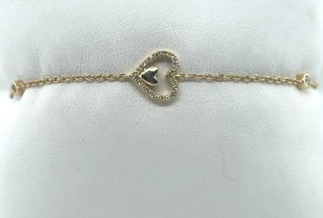 14K petite diamond heart bracelet. Set in the center of the bracelet is one diamond-set open heart ornament, with a high polished mini heart inside. The heart is set with 26 round single-cut, natural diamonds, I-color, SI2-clarity, prong set. The heart measures approx. 10.5mm x 9.5mm. The bracelet also has two small bezel set round natural diamonds, set 1" from the center ornament, 0.14ctw. The heart is attached to a rolo chain that measures 6.5" in length, with a 1" extender. 2.0 grams.