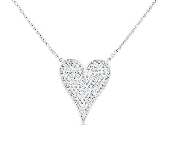 14K white gold diamond heart pendant. This stylized heart has a gentle curve and elongated drop for a contemporary twist on a classic symbol. Pave set with 119 round full-cut natural diamonds, totaling 0.26ctw, H-color, SI1-clarity. The heart measures approx. 17.75 x 12.5mm, and is attached to an 18" rolo chain, with o'rings at 16" and 17".