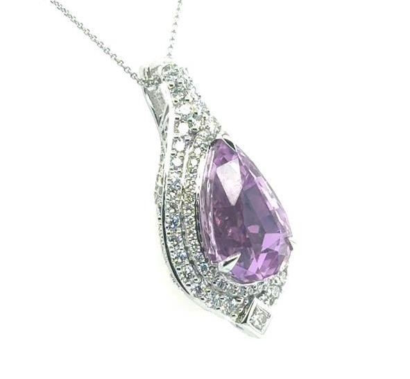 18K white gold kunzite and diamond pendant. The primary stone is an pear shape kunzite, 10.15ct actual weight, displaying its signature soft yet vivid pinkish-lavendar hue. The stone has exceptional brilliance and clarity. Set using three prongs, the stone is surrounded by a double halo of prong set, round brilliant-cut natural diamonds, with one bezel set princess cut diamond set at the base of the primary stone. The overall diamond carat weight is 1.12ctw., H-color, VS2-clarity. The pendant hangs on an 18" cable chain. 7.5 grams.